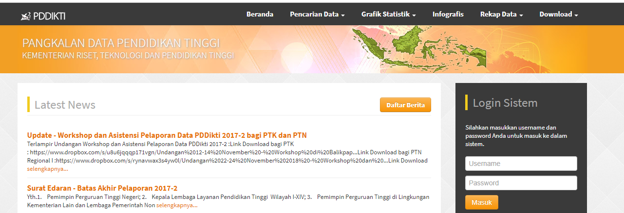 Profil Perguruan Tinggi sampai Grafik Statistik Jumlah Perguruan Besar yang terdapat di Di Indonesia. Melaksanakan pengecekan Informasi Mahasiswa di Forlap PDDIKTI jadi keharusan bagai tiap mahasiswa, karna dengan membenarkan informasi kamu sudah terdaftar pada Forlap PDDIKTI Menunjukkan kalau legalitas kamu selaku mahasiswa jelas. Sebab dijaman saat ini sangat banyak Perguruan Tinggi yang bandal, disamping itu dengan melaksanakan pengecekan informasi pada Forlap PDDIKTI hingga kamu bisa memandang Riwayat Pembelajaran Kamu. serta bila kamu menciptakan kejanggalan ataupun kesalahan informasi hingga kamu hingga kamu bisa mempertanyakan ke kampus kamu terdaftar sebab informasi dari Forlap PDDIKTI merupakan informasi yang bersumber dari Akademi Besar Di segala Indonesia.