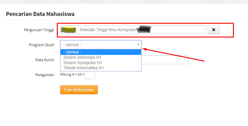 3. Setelah itu sesi berikutnya merupakan, mengisi form pencarian informasi mahasiswa, pada Form awal isi nama Perguruan Tinggi, setelah itu hendak timbul catatan Program Studi yang terdapat perguruan tinggi, berikutnya seleksi Jurusan Kalian.