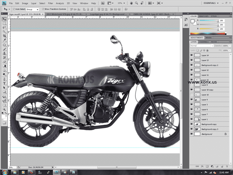 Proses pembuatan menggabungkan Moto Guzzi V7 dengan Honda Tiger dengan photoshop terlihat dikanan beberapa layers.