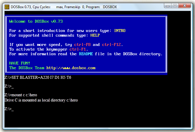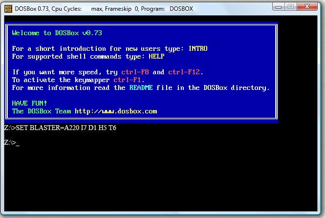Caranya pakai emulator DOS namanya DOSBox. DOS emulator ini bisa didownload untuk semua operasi sistem selain windows juga. Cek ke sini untuk download http://www.dosbox.com/. Kalau udah download dan di install buka program DOSBoxnya muncul seperti di bawah