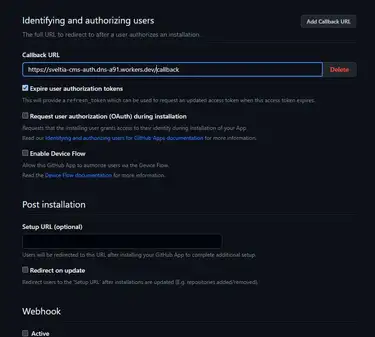 Nah paling terpenting ini, callback URL akan membaca auth dari Workers Cloudflare yang sudah kita bikin sebelumnya. URL nya https://urlworkertadi/callback. Webhook unceklis saja. Karena tidak perlu, karena di awal sudah ada Workflow, jadi ketika ada file update dengan CMS sudah otomatis konek ke Cloudflare.
