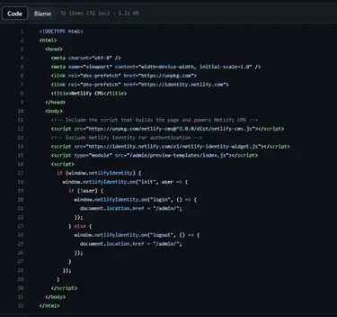 Secara default Netlify CMS atau Decap CMS file index.html aku seperti ini. Tidak ada yang dirubah. Kecuali kalian pakai Sveltia CMS atau StaticCMS baru si netlifyJS nya dihapus, biasanya ada di dalam <body>. Sudah aku tes bisa pakai selain Netlify CMS seperti StaticCMS dan yang serupa CMS nya.