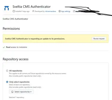 Balik lagi ke GitHub, jangan lupa si GitHubnya install di akun kamu, dan pilih Repo Static Generatornya ya, bukan Auth CMS tadi, misal repo Hugo atau Eleventy tempat website kalian. Bisa di select lebih dari satu.