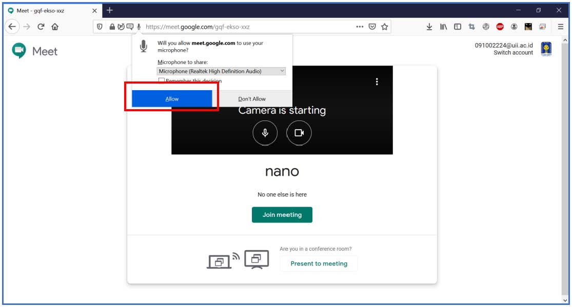 3. Cara menggunakan Google Meet / Hangouts Meet sebagai Peserta, sama seperti awal sebelumnya sudah login ke meet.google.com, lalu ambil link yang host bagikan kepada kamu. Sebagai contoh buka seperti link ini https://meet.google.com/abc-defg-hij. Muncul seperti di bawah dengan notifikasi. Langsung saja klik ALLOW seperti sebelumnya juga untuk mengijinkan akses pada microphone dan web camera anda.